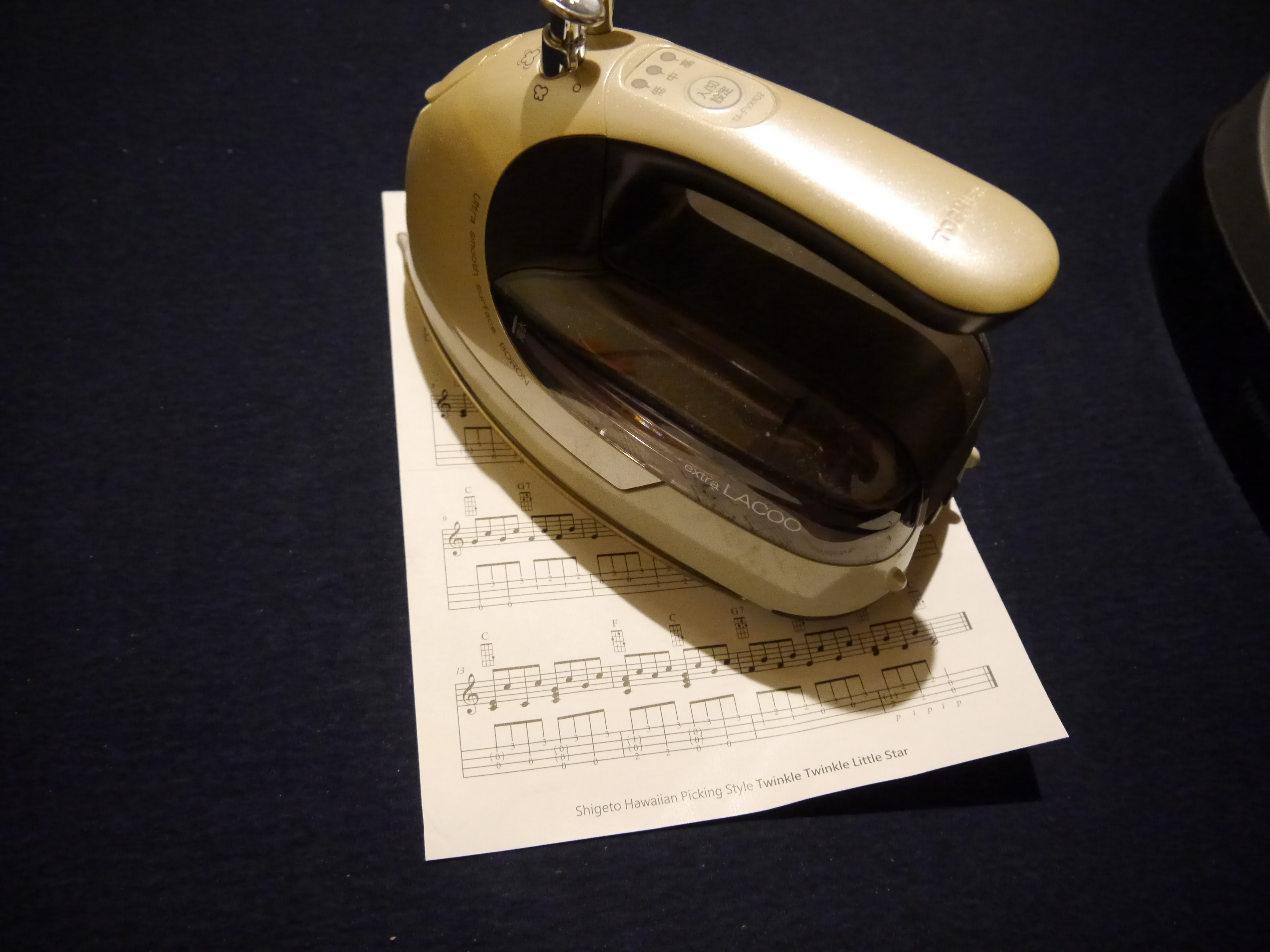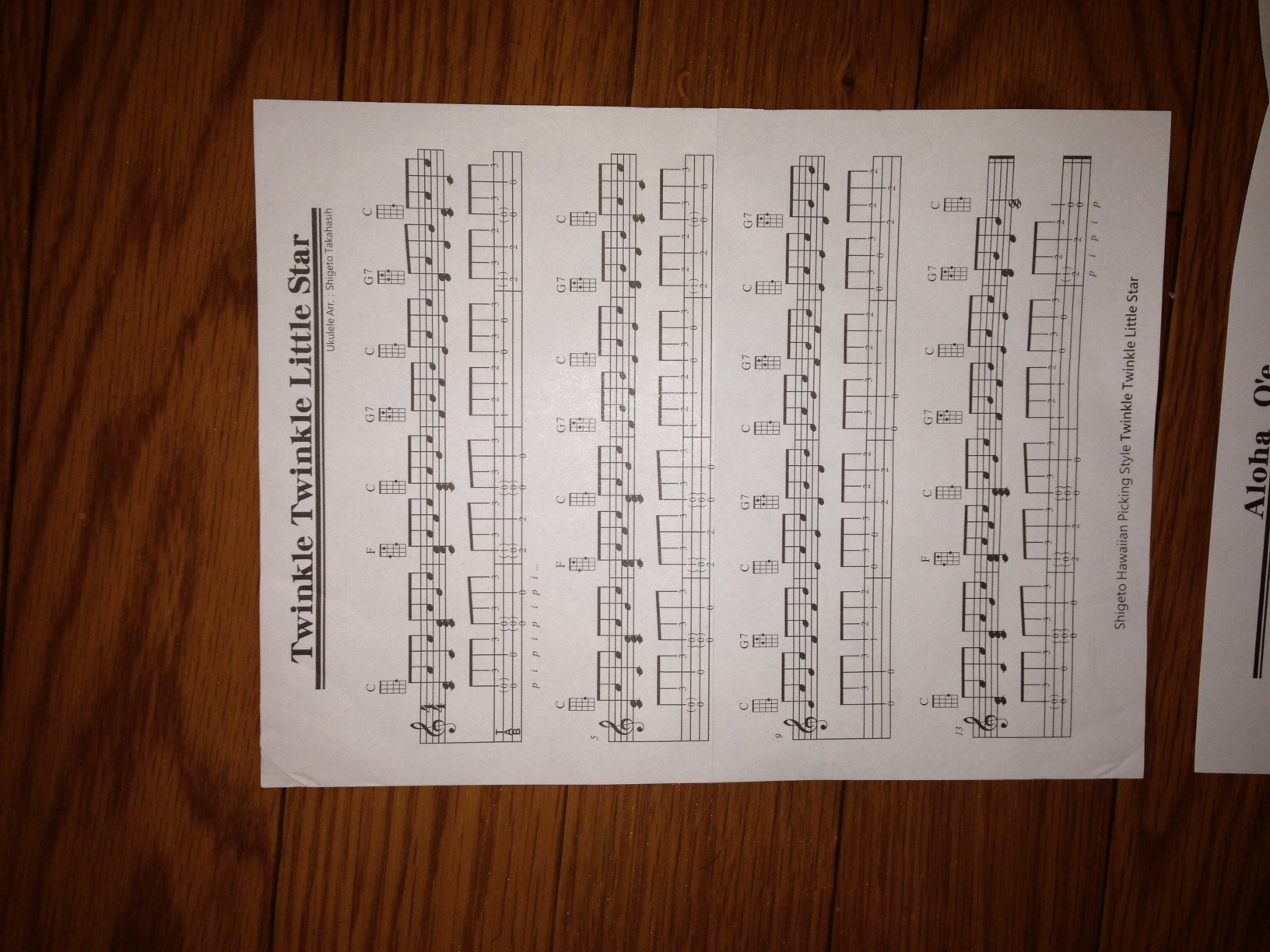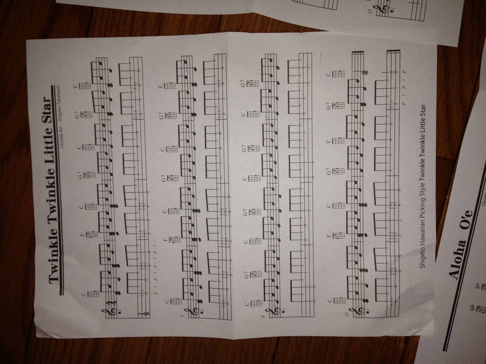 1:Twinkle Twinkle Little Star1段目の4小節のG7のところの1弦が3フレット表記になっていますが2フレットが正解です。