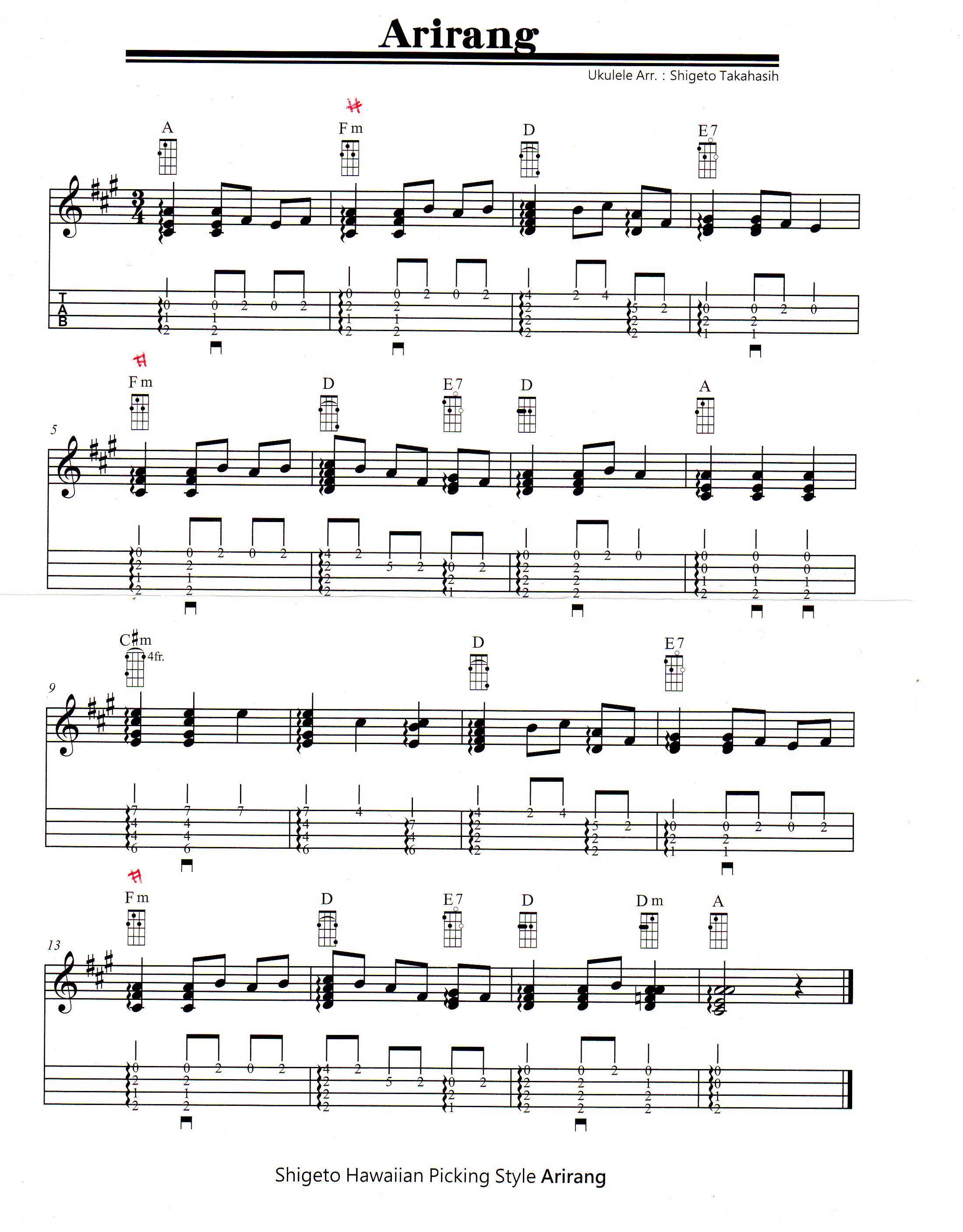Junさんご指摘ありがとうございました!3アリラン1段目2小節、2段目1小節、4段目1小節Fm→F#mと修正しました。コード名表記間違い。アリラン085